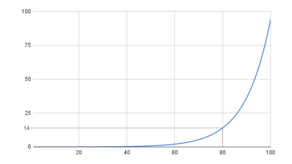 In an extremely unequal society, the Lorenz curve hugs the x-axis for most of its length (indicating that the bottom majority hold very little wealth), before shooting up sharply at the end (where the wealthiest hold almost all the wealth). In the below the lower 80% own 14% of total wealth.